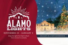 Celebrate the holidays at the Shrine of Texas Liberty with Alamo Lights! Join us after hours at the Alamo to experience the iconic site decorated for the holiday season – from the traditional Christmas tree on the Plaza to festive lights illuminating the gardens.