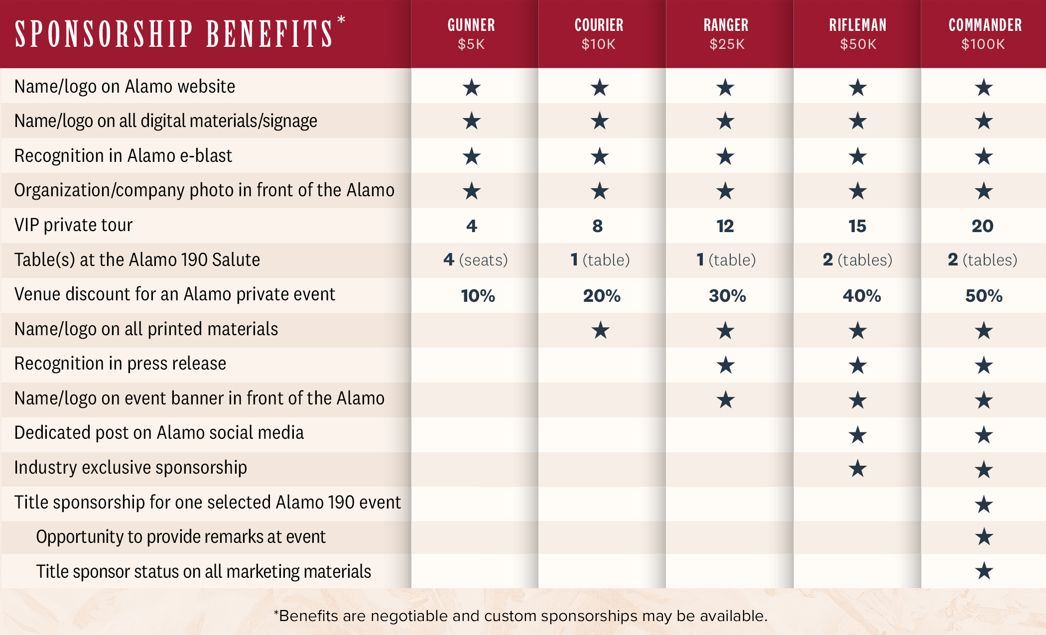 In 2026, we will commemorate the 190th anniversary of the Battle of the Alamo, and sponsors will receive recognition at all major Alamo events such as the year long History Heroes school campaign, Commemoration of the 13 Day Siege: February 23 – March 6, The Alamo 190 Salute: February 28, Stars and Stripes Salute: July 4, Military Appreciation Day: November 11, Christmas at the Alamo, and more. Sponsor today to ensure that future generations will Remember the Alamo!