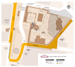 Crockett Street in front of the Menger Hotel remains closed to vehicular traffic but is now open for use as a temporary valet area for the Menger Hotel. This portion of the street remains open to pedestrian foot-traffic. Fencing in the south end of Alamo Plaza has been removed with the exception of fencing around the bandstand area. A portion of the south end of Alamo Plaza, including sections of Bonham, Crockett, and Alamo Streets are still closed for Alamo Plan Phase One construction.