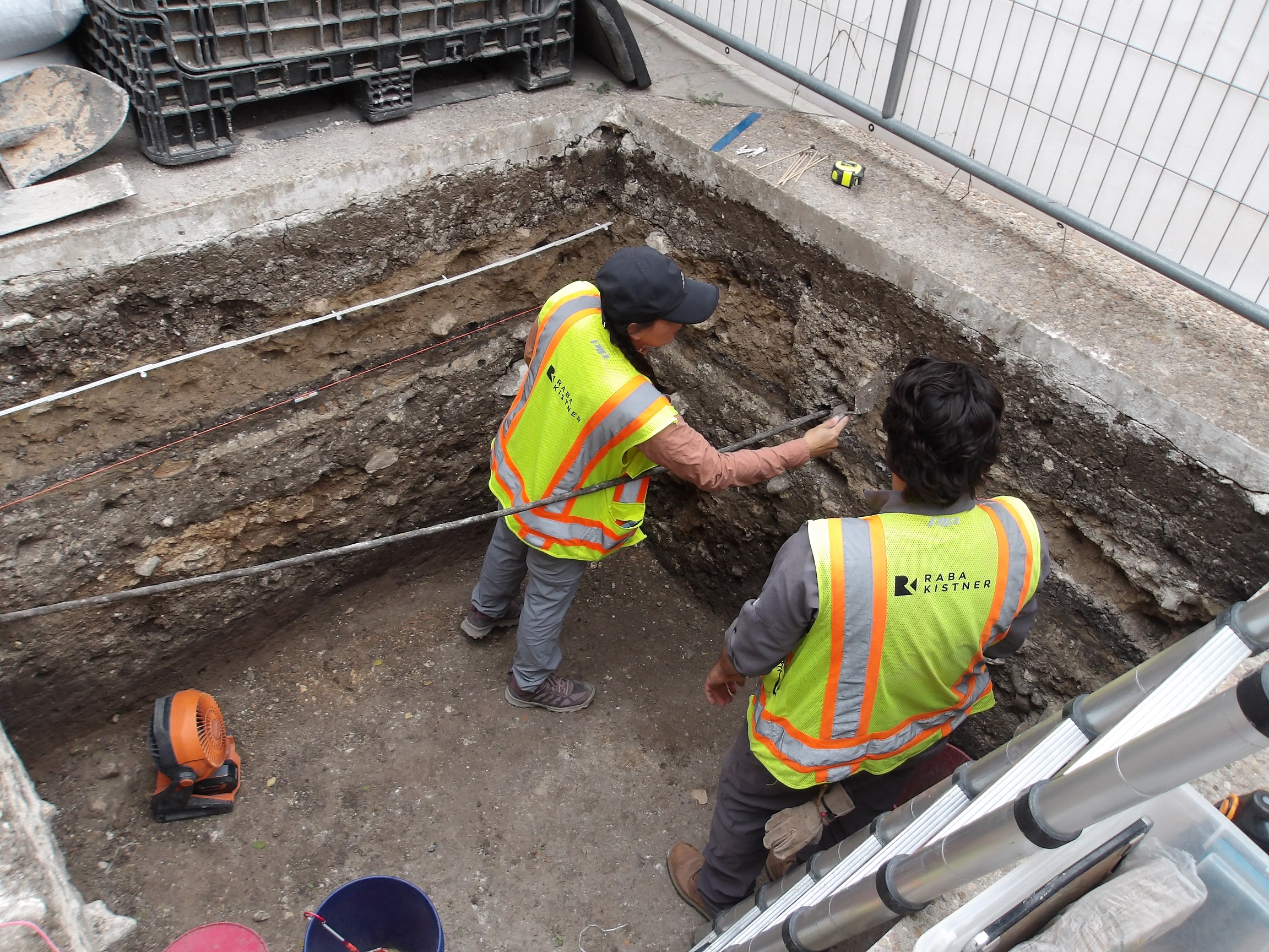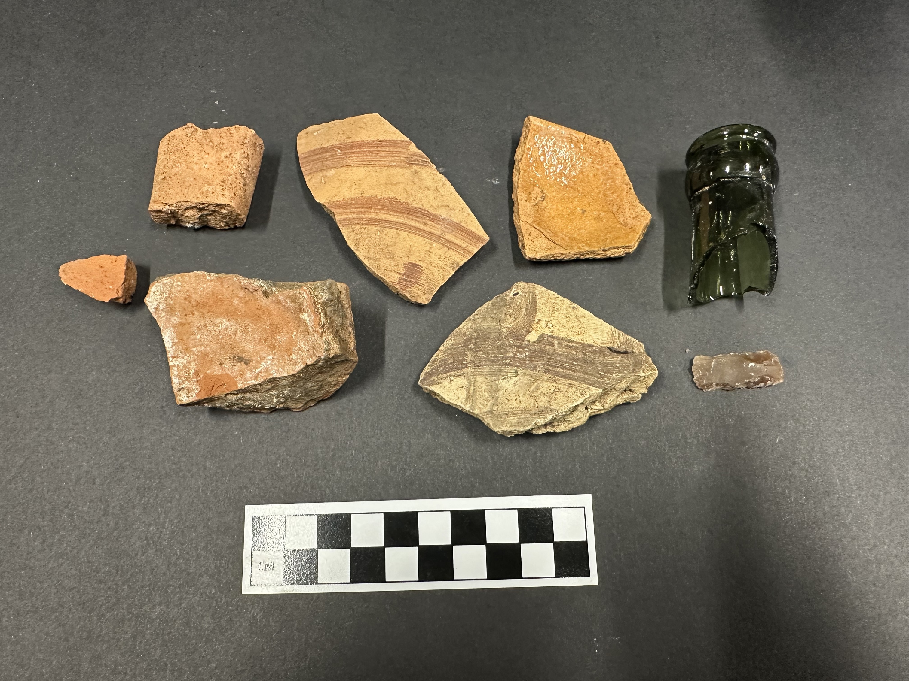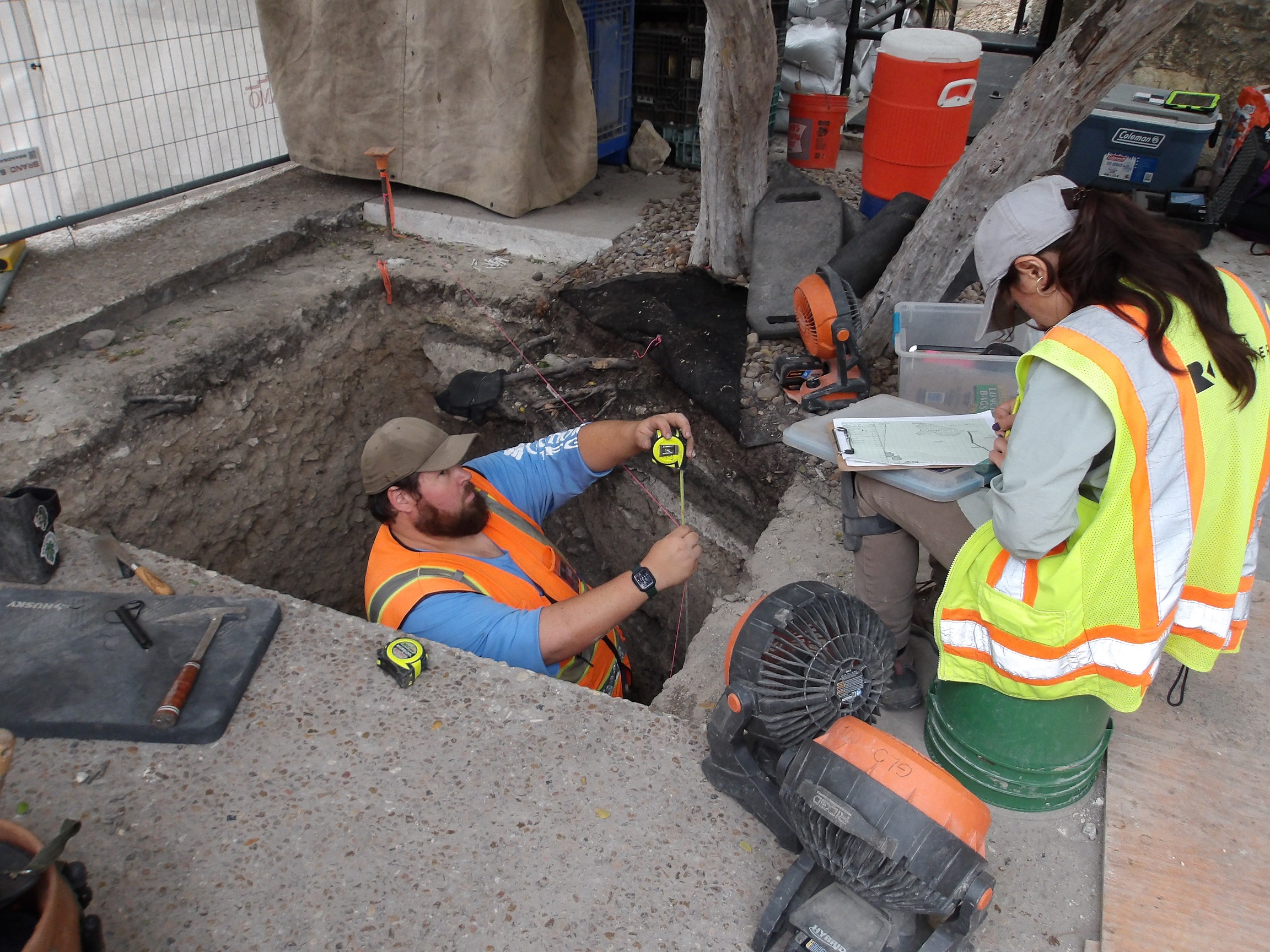 In EU4, archaeologists excavated to approximately 150 cm below surface. The upper levels of EU4 consisted of modern disturbance, including construction fill, large roots, and an abandoned irrigation line. The lower levels have been mostly intact due to the absence of modern disturbance and presence of diagnostic ceramic sherds. Diagnostic artifacts include several Valero Red Painted sherds, Galera, an olive glass bottle neck/finish, and a partial gun flint. Now that excavation has been completed, archaeologists will soil profile two of the unit walls and execute final unit documentation.